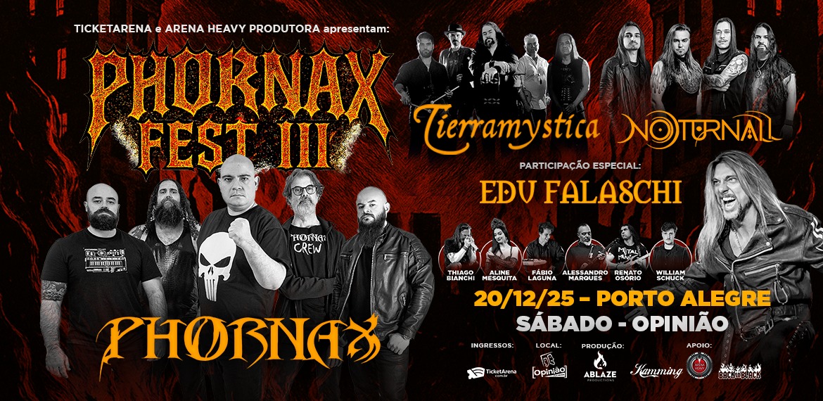 O destaque da noite fica para EDU FALASCHI, um dos maiores nomes do metal brasileiro, que se juntará ao Phornax para uma performance histórica. Também estarão presentes Fabio Laguna, Thiago Bianchi, Aline Mesquita, Alessandro Marques, William Schuck e Renato Osório, completando um time de estrelas que vai transformar o palco do Opinião em um verdadeiro templo do metal.